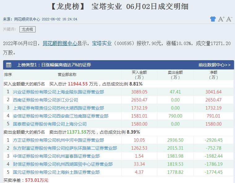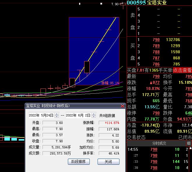 6月2日,寶塔實(shí)業(yè)再度漲停,截至收盤,報(bào)7.9元,實(shí)現(xiàn)8連板,期間累計(jì)漲達(dá)114.67%,最新總市值達(dá)89.95億元。