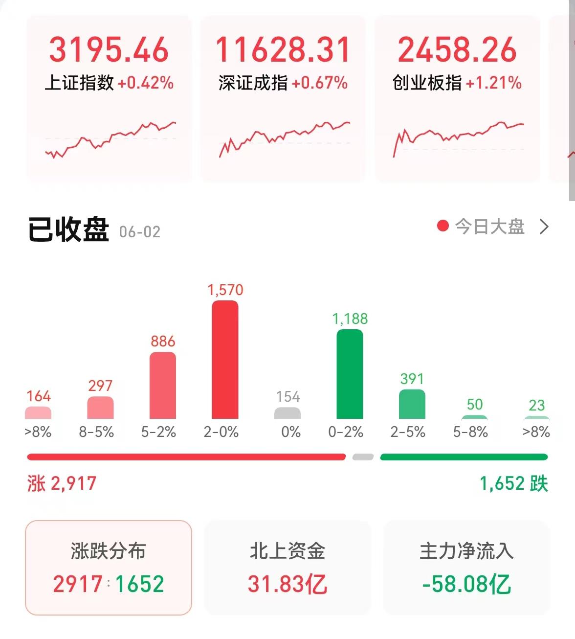 6月2日,三大股指集體收漲,截至收盤,上證指數(shù)漲0.42%報(bào)3195.46點(diǎn),深證成指漲0.67%報(bào)11628.31點(diǎn),創(chuàng)業(yè)板指漲1.21%報(bào)2458.26點(diǎn);兩市合計(jì)成交8917億元,北向資金凈買入31.83億元??傮w來(lái)看,兩市個(gè)股漲多跌少。