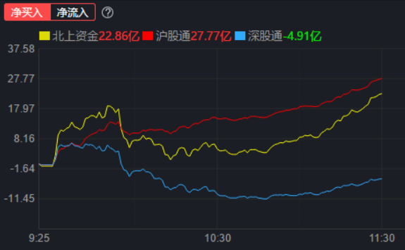 資金方面,北向資金早盤凈買入22.86億元,其中,滬股通凈買入27.77億元;深股通凈賣出4.91億元。