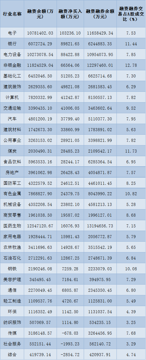 表:6月6日申萬一級(jí)行業(yè)兩融交易情況: