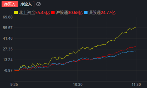 資金方面,北向資金早盤凈買入55.45億元,其中,滬股通凈買入30.68億元;深股通凈買入24.77億元。