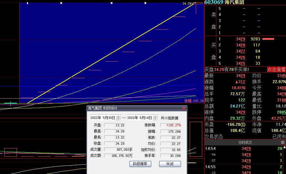 6月14日,熱門(mén)股海汽集團(tuán)再度漲停,截至收盤(pán),報(bào)34.29元,總市值達(dá)108.4億元,走出了11連板,期間累計(jì)漲達(dá)185.27%。