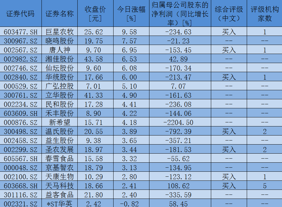 值得一提的是,最近30日內(nèi),天馬科技、圣農(nóng)發(fā)展、溫氏股份、巨星農(nóng)牧、天康生物、唐人神、華統(tǒng)股份等7只養(yǎng)雞概念股還獲得了機(jī)構(gòu)給予的看好評(píng)級(jí)。
