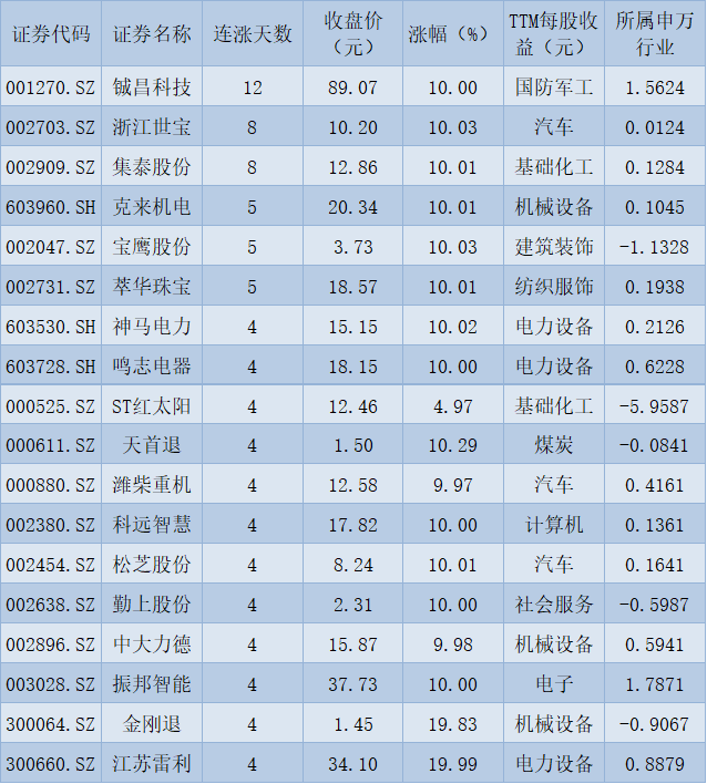 表:連續(xù)上漲4天且今日收盤漲停股一覽