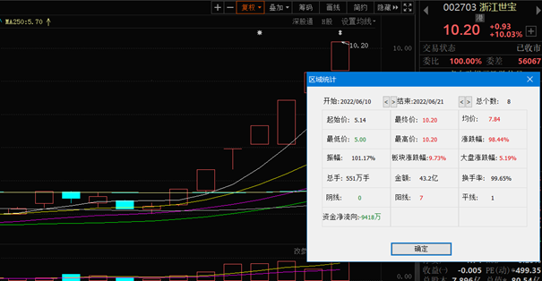 6月21日,熱門汽車零部件股浙江世寶再度漲停,這已是該股6月13日以來連續(xù)第7個漲停板,截至收盤,報10.20元,總市值達56.41億元。該股自6月10日以來,8個交易日累計漲幅達98.44%。