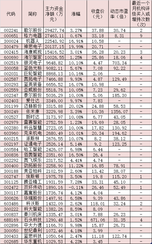 表:6月21日受到超千萬(wàn)元主力資金追捧的機(jī)器人概念股
