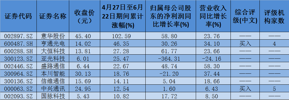 表:4月27日至6月22日,6G概念板塊個(gè)股期間累計(jì)漲幅一覽