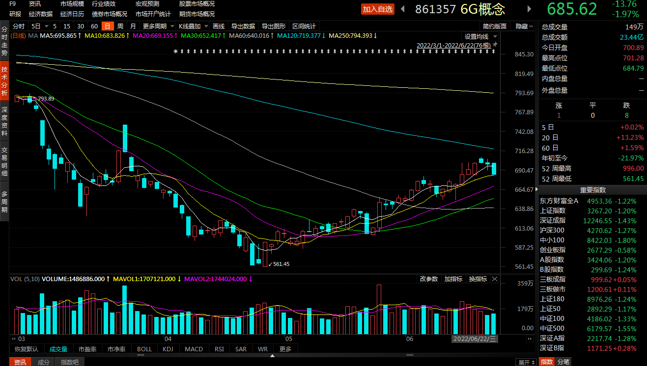 受利好消息等多重因素影響,近期A股東方財(cái)富6G概念板塊漲幅較大。自4月27日大盤反彈以來,截至6月22日收盤,6G概念板塊期間累計(jì)上漲21.05%,大幅跑贏上證指數(shù)(期間累計(jì)漲幅為13.19%)。