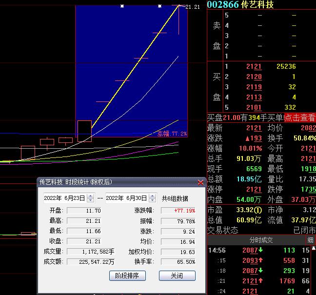 6月30日,熱門股傳藝科技再度漲停,截至收盤,報(bào)21.21元,連續(xù)6個(gè)交易日漲停,期間累計(jì)漲達(dá)77.19%。