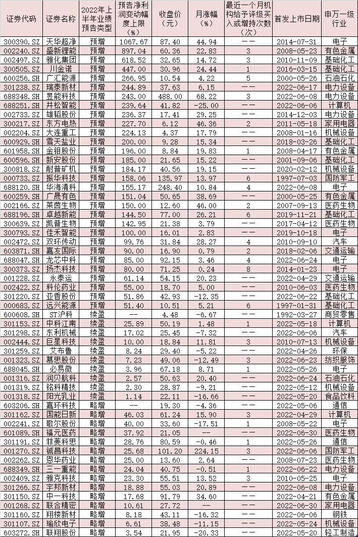 表:已披露2022年上半年業(yè)績(jī)預(yù)喜公司
