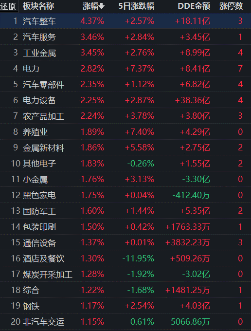 同花順行業(yè)方面,截至7月7日11:30,76類行業(yè)中有58類上漲,占比76.32%。汽車整車行業(yè)居漲幅榜首,漲幅達(dá)4.37%,此外,汽車服務(wù)和工業(yè)金屬行業(yè)漲幅也均超3%;跌幅居首的行業(yè)是服裝家紡,下跌1.37%。