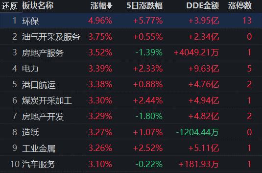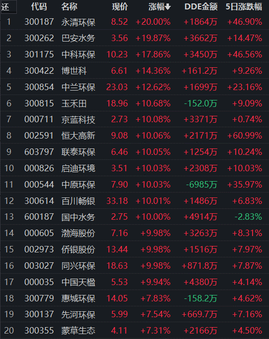 從領(lǐng)漲的環(huán)保行業(yè)看,截至7月18日11:30,行業(yè)交易中的131只個股,有129只上漲,其中,有13只個股漲停,有49只個股漲幅超5%。從資金流向看,環(huán)保行業(yè)今天上午大單資金凈流入額達3.95億元,居各行業(yè)第10位。