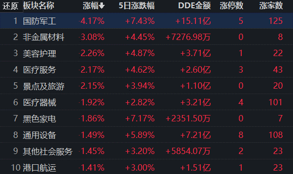 從漲幅居首的國(guó)防軍工行業(yè)看,截至7月20日11:30,行業(yè)交易中的126只個(gè)股,有125只上漲,其中,有5只個(gè)股漲停,有35只個(gè)股漲幅超5%。從資金流向看,國(guó)防軍工行業(yè)今天上午大單資金凈流入額達(dá)15.11億元,居各行業(yè)第1位。