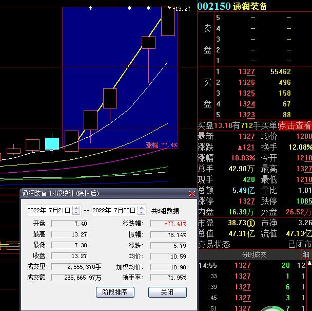 7月28日,熱門股通潤裝備再度漲停,截至收盤,報13.27元,連續(xù)6個交易日漲停,期間累計漲幅達77.41%。龍虎榜數(shù)據(jù)顯示,買入總計8612.01萬元,占總成交額比5.79%,賣出總計14348.02萬元,占總成交額比9.64%,凈賣出額5736.01萬元,占龍虎榜總成交額比24.98%。