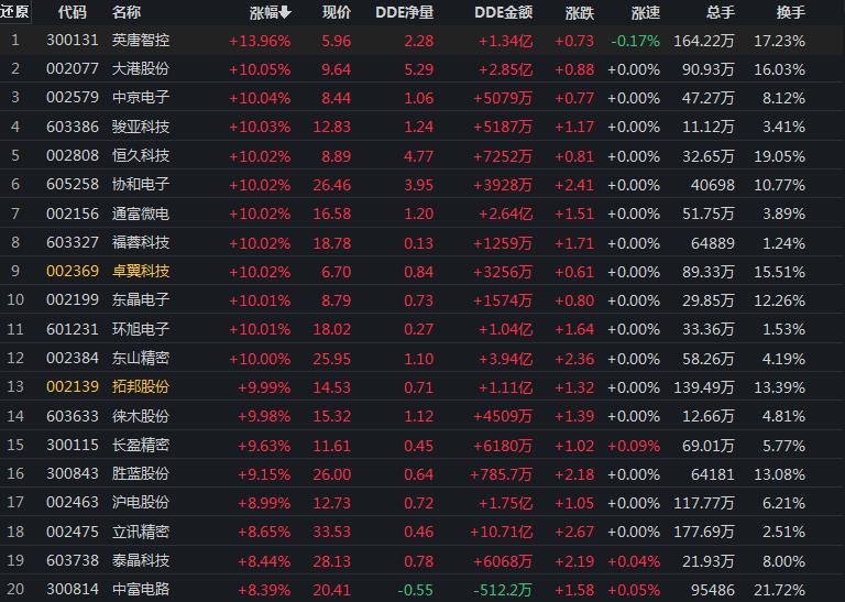 電子行業(yè)漲3.19% 14股集體漲停