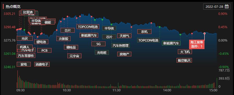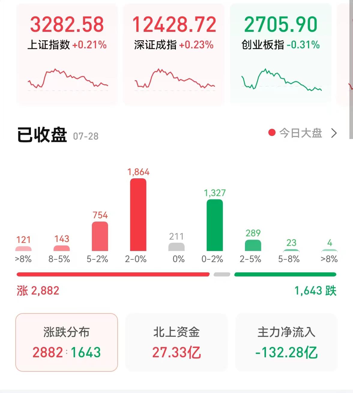 7月28日,三大股指震蕩,漲跌不一。截至收盤,上證指數(shù)漲0.21%報3282.58點,深證成指漲0.23%報12428.7點,創(chuàng)業(yè)板指跌0.31%報2705.90點;兩市合計成交額達10074億元,突破萬億元關(guān)口;北向資金凈買入27.33億元;總體來看,兩市個股漲多跌少。