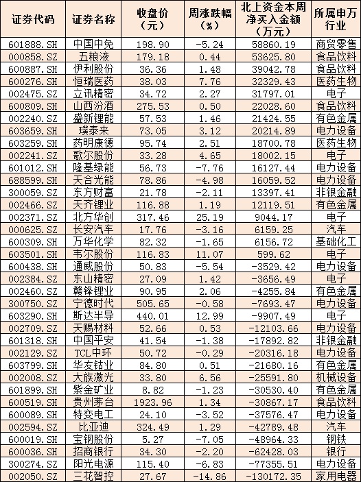 資金方面,北向資金本周累計凈賣出金額達(dá)12.33億元。從前十大成交活躍股來看,中國中免、五糧液、伊利股份、恒瑞醫(yī)藥、立訊精密等個股,北向資金凈買入金額均超3億元。另外,三花智控、陽光電源、招商銀行、寶鋼股份、比亞迪等個股遭北向資金凈賣出金額均超4億元。