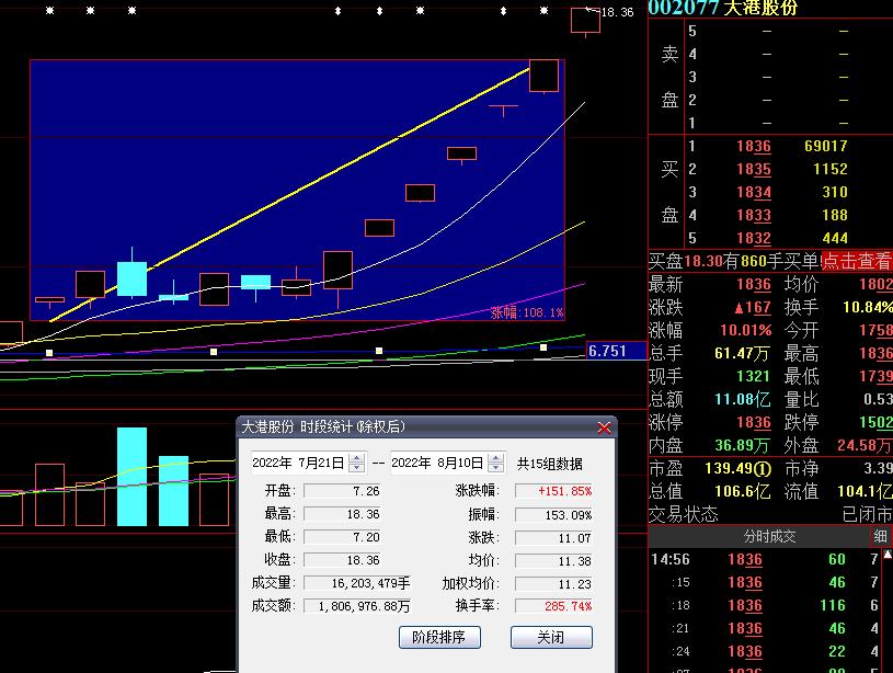 8月10日,大港股份高開高走后再度漲停,截至收盤,大港股份報18.36元,總市值106.6億元,實現(xiàn)7連板。值得關(guān)注的是,自7月21日啟動以來,該股15個交易日中,有11個漲停板,期間累計漲幅達151.85%。