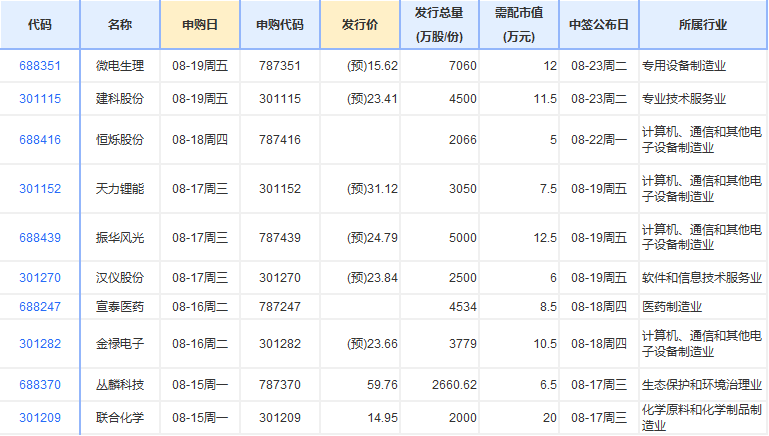 新股方面,根據(jù)發(fā)行安排,A股市場下周(8月15日-8月19日)將有10只新股申購。