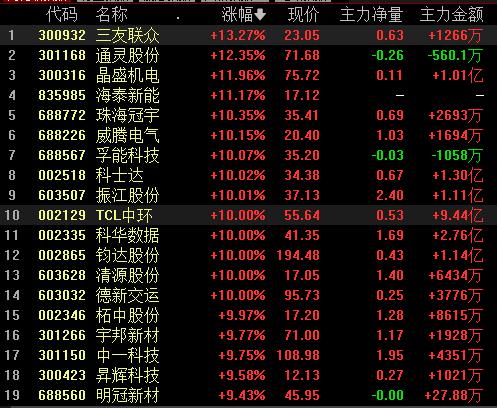 8月15日,申萬一級行業(yè)中電力設(shè)備強勢上漲,漲幅達3.35%,主力資金凈流入達64.44億元。行業(yè)311只交易中的個股,有274只上漲,其中,包括川潤股份、科士達、振江股份、TCL中環(huán)、科華數(shù)據(jù)、清源股份等在內(nèi)的10只個股集體漲停。