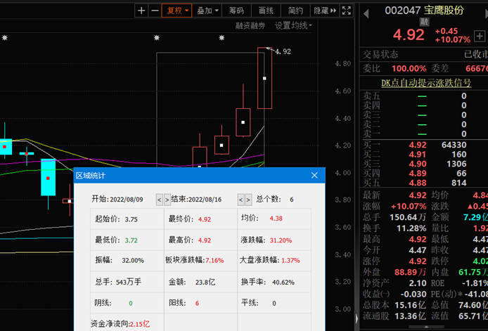 8月16日,寶鷹股份漲10.07%,報(bào)4.92元。該股自8月9日以來,截至8月16日已連續(xù)6個(gè)交易日上漲,累計(jì)漲幅達(dá)31.20%。最新該股A股總市值達(dá)74.60億元,A股流通市值65.71億元。