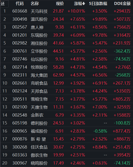 8月19日,申萬(wàn)一級(jí)行業(yè)中農(nóng)林牧漁領(lǐng)漲,漲幅達(dá)3.06%。95只交易中的個(gè)股,有56只上漲,其中,有1只個(gè)股漲停,6只個(gè)股漲幅超5%。