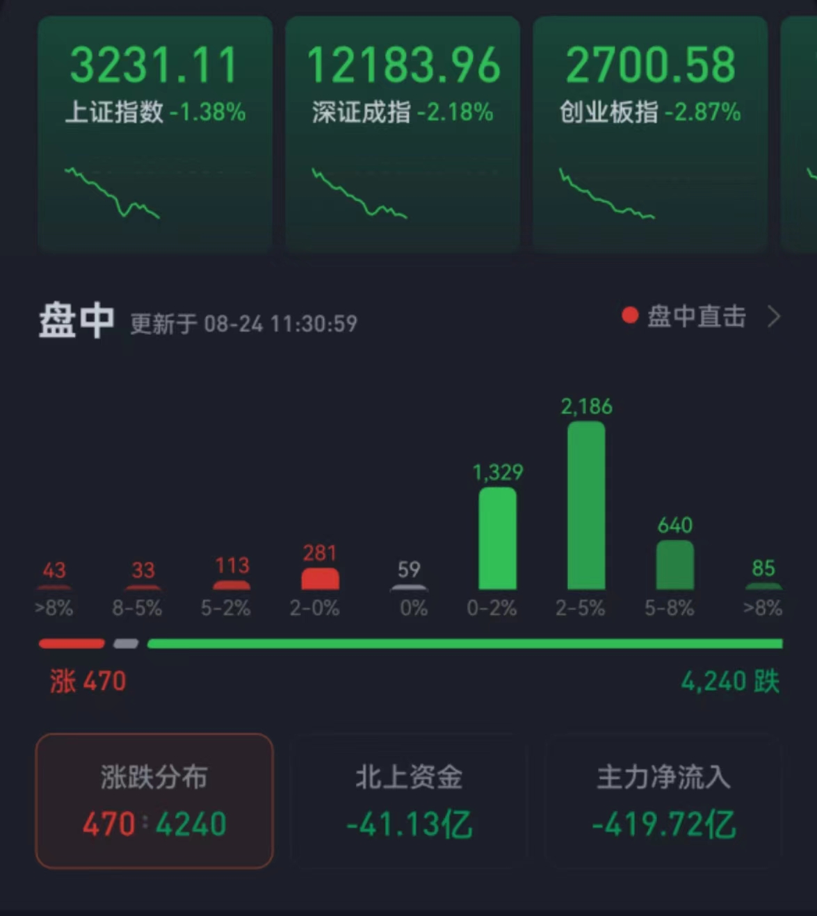 周三(8月24日),三大股指震蕩回落。截至上午收盤(pán),三大股指跌幅均逾1%,上證指數(shù)跌幅達(dá)1.38%,報(bào)3231.11點(diǎn);深證成指和創(chuàng)業(yè)板指跌幅分別為2.18%和2.87%;滬深兩市合計(jì)成交額7384.7億元,總體來(lái)看,兩市個(gè)股跌多漲少,逾4000只個(gè)股下跌。