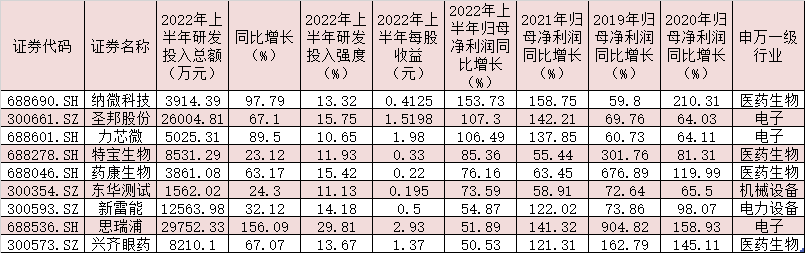 表:今年上半年研發(fā)投入強(qiáng)度超10%且2019年、2020年、2021年、2022年上半年歸母凈利潤(rùn)同比增長(zhǎng)均超50%的公司
