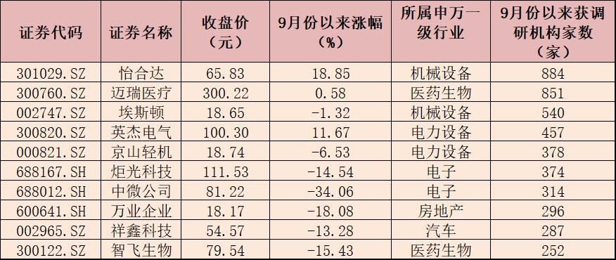 表:9月份以來獲調(diào)研機(jī)構(gòu)家數(shù)居前10的公司一覽