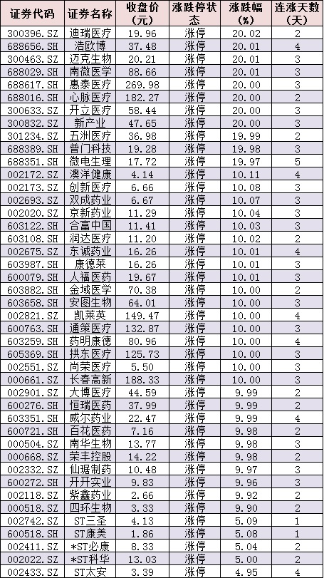 10月14日,醫(yī)藥生物行業(yè)漲幅居首,達(dá)7.13%。有43只醫(yī)藥股集體漲停,其中,迪瑞醫(yī)療、浩歐博、邁克生物、南微醫(yī)學(xué)、惠泰醫(yī)療、心脈醫(yī)療、開立醫(yī)療、新產(chǎn)業(yè)等多只醫(yī)藥股均為20cm漲停。