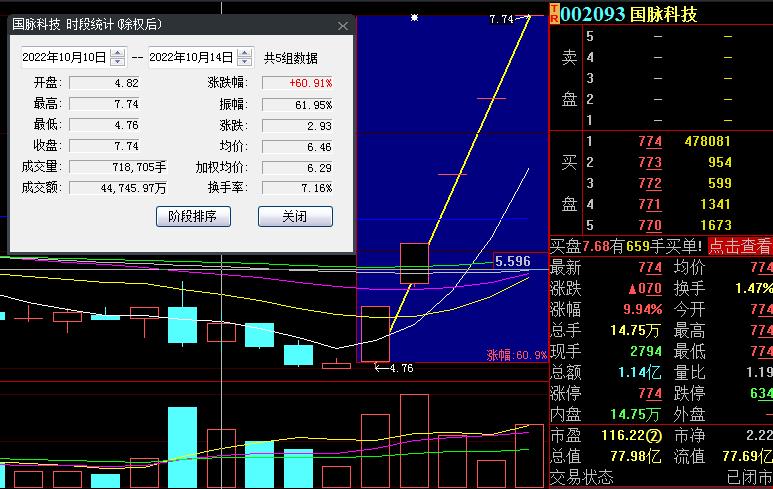 10月14日,熱門股國(guó)脈科技再度漲停,截至收盤,報(bào)7.74元,連續(xù)5個(gè)交易日漲停,累計(jì)漲幅達(dá)60.91%。