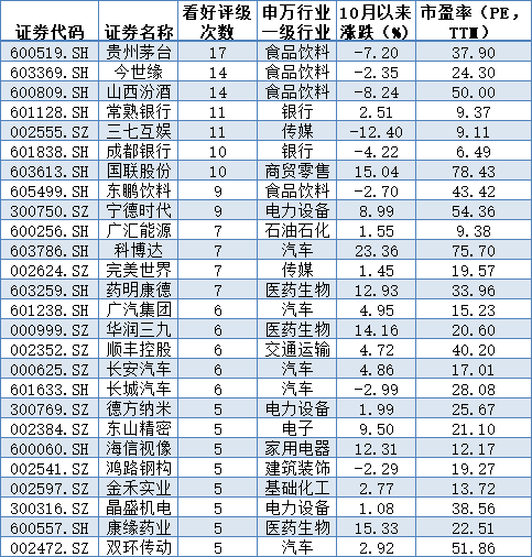 從獲得看好評級次數(shù)來看,有26家公司獲得看好評級次數(shù)均在5次及以上,其中,貴州茅臺關(guān)注度最高,獲得17次機(jī)構(gòu)看好評級。此外,山西汾酒、今世緣、常熟銀行、三七互娛獲得看好評級次數(shù)也超過10次。