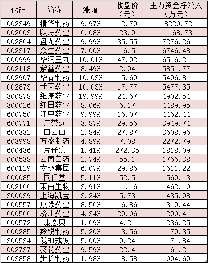 表:10月18日主力資金凈流入超千萬元的中藥概念股