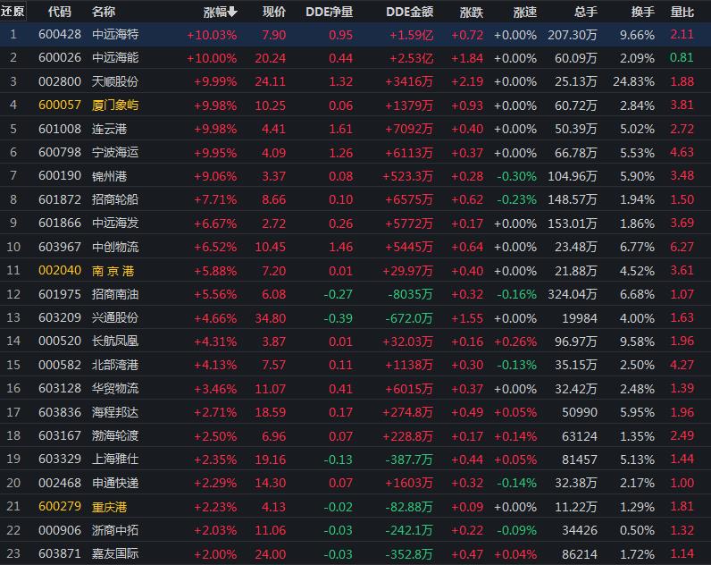 具體來(lái)看,交通運(yùn)輸板塊中,連云港、天順股份、廈門(mén)象嶼、中遠(yuǎn)海特、中遠(yuǎn)海能、寧波海運(yùn)等6只概念股集體漲停。
