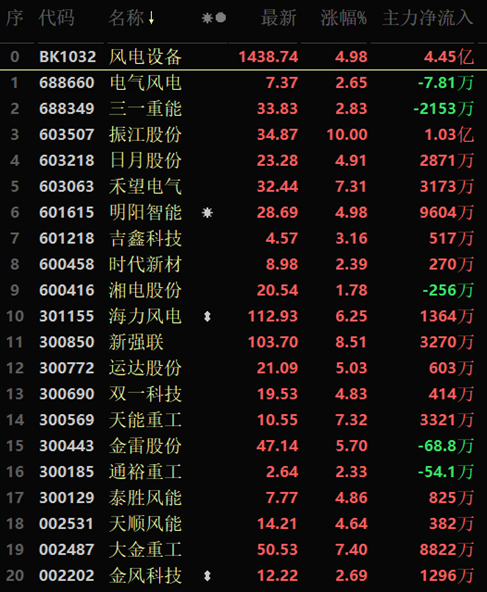 從漲幅居首的風電設備行業(yè)看,截至10月21日11:30,該行業(yè)交易中的20只個股全線上漲,其中8只漲幅超5%。從資金流向看,該行業(yè)今天上午大單資金凈流入額達4.45億元,居行業(yè)第4位。