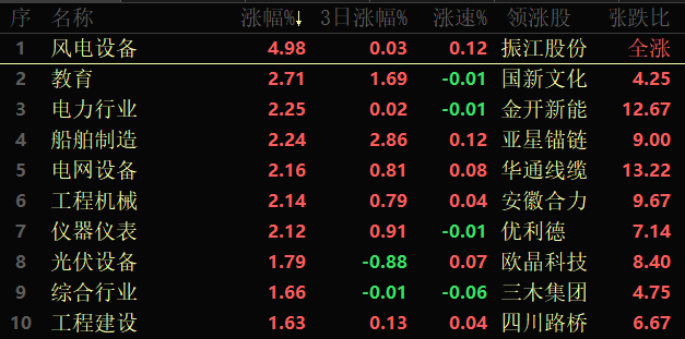 東方財富行業(yè)方面,截至10月21日11:30,86類行業(yè)中64類上漲,占比74.42%,其中,風電設備行業(yè)漲幅達4.98%,排名首位,包括教育和電力行業(yè)在內(nèi)的6類行業(yè)漲幅均超2%。下跌的行業(yè)中,半導體居首,跌幅達1.78%。