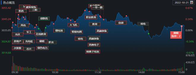 截至10月21日收盤,上證指數(shù)漲0.13%,收?qǐng)?bào)3038.93點(diǎn),深證成指跌0.42%,收?qǐng)?bào)10918.97點(diǎn),創(chuàng)業(yè)板指跌0.27%,收?qǐng)?bào)2395.16點(diǎn);滬深兩市合計(jì)成交額7123.2億元,較前一交易日縮減10.54%;北向資金凈賣出89.23億元;總體來(lái)看,A股上漲個(gè)股為2156只,下跌個(gè)股2438只。