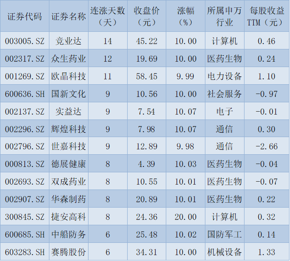 表:連續(xù)上漲6天且今日收盤漲停股一覽