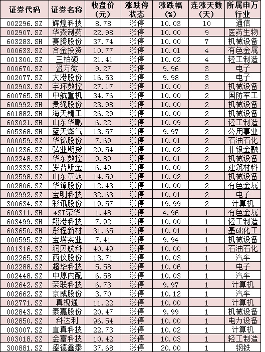 表:今日收盤漲停個股情況: