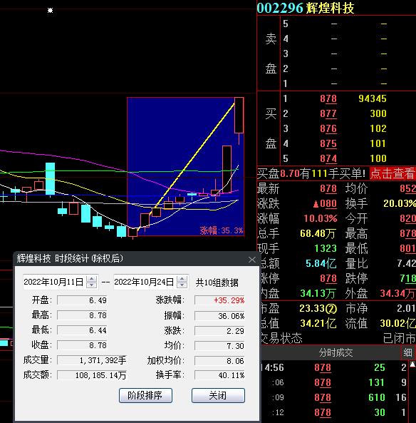 10月24日,熱門股輝煌科技再度漲停,截至收盤,報8.78元,連續(xù)2個交易日漲停,實現(xiàn)十連漲,期間累計漲幅達35.29%。