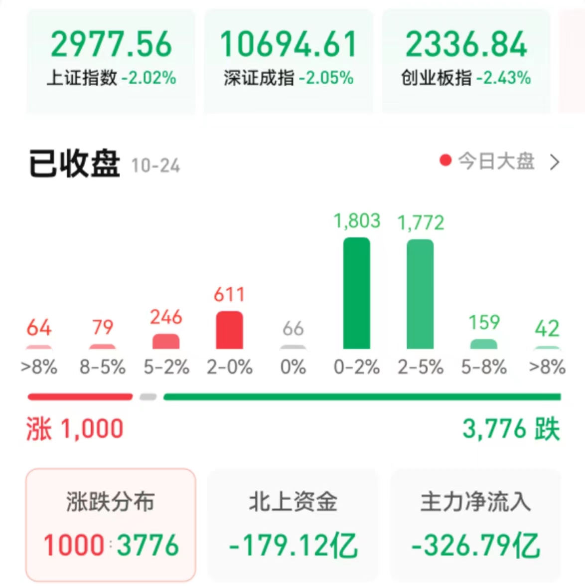 周一(10月24日),A股三大指數(shù)集體收跌,跌幅均超2%。截至收盤,上證指數(shù)報2977.56點失守3000點,跌幅2.02%;深證成指報10694.61點,跌幅2.05%;創(chuàng)業(yè)板指報2336.84點,跌幅2.43%。滬深兩市合計成交額8810億元;北向資金凈賣出179.12億元;總體來看,A股個股跌多漲少。