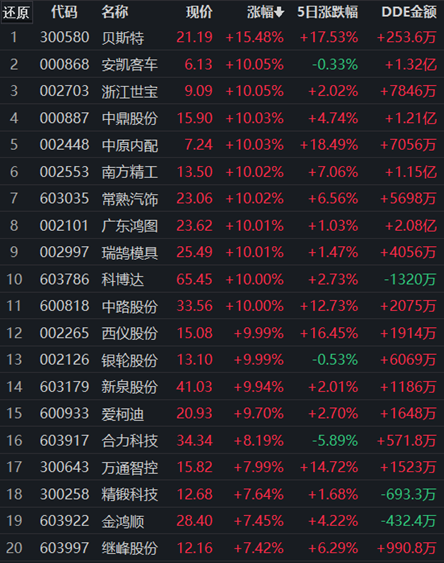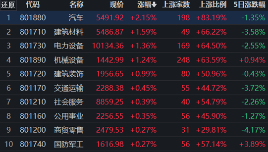10月25日,申萬一級行業(yè)中汽車行業(yè)領(lǐng)漲,漲幅達(dá)2.15%,獲得10.21億元大單資金的凈流入,居第一位。行業(yè)237只交易中的個(gè)股,有198只上漲,占比83.54%,其中,41只個(gè)股漲幅超5%。