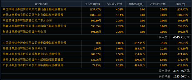 深交所公開信息顯示,當(dāng)日該股因日收盤價(jià)漲幅達(dá)20.00%、日換手率達(dá)36.70%上榜,營業(yè)部席位合計(jì)凈買入1623.95萬元。