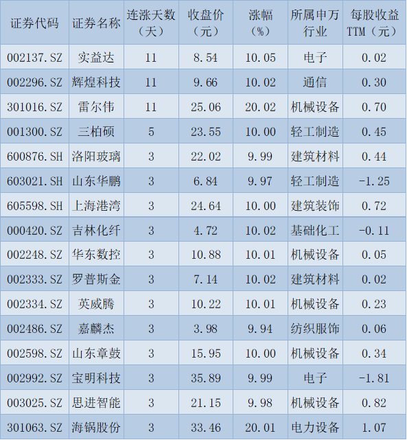 表:連續(xù)上漲3天且今日收盤漲停股一覽