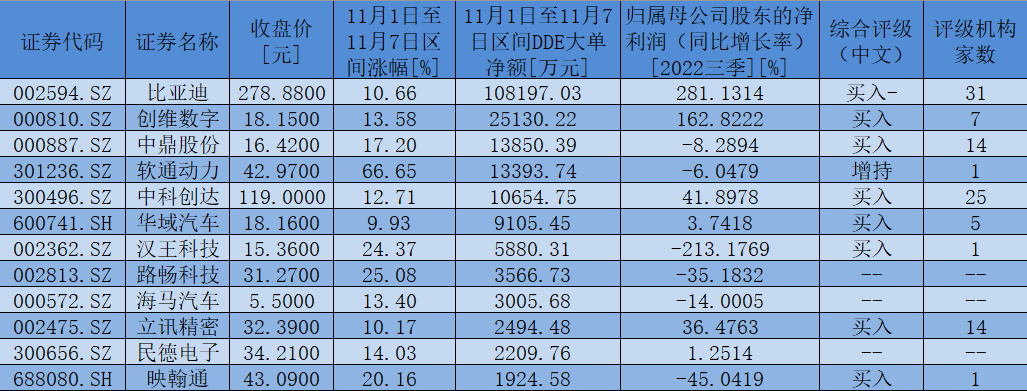 表:11月1日至11月7日,獲大單資金凈流入額超1000萬元的智能汽車板塊個(gè)股一覽