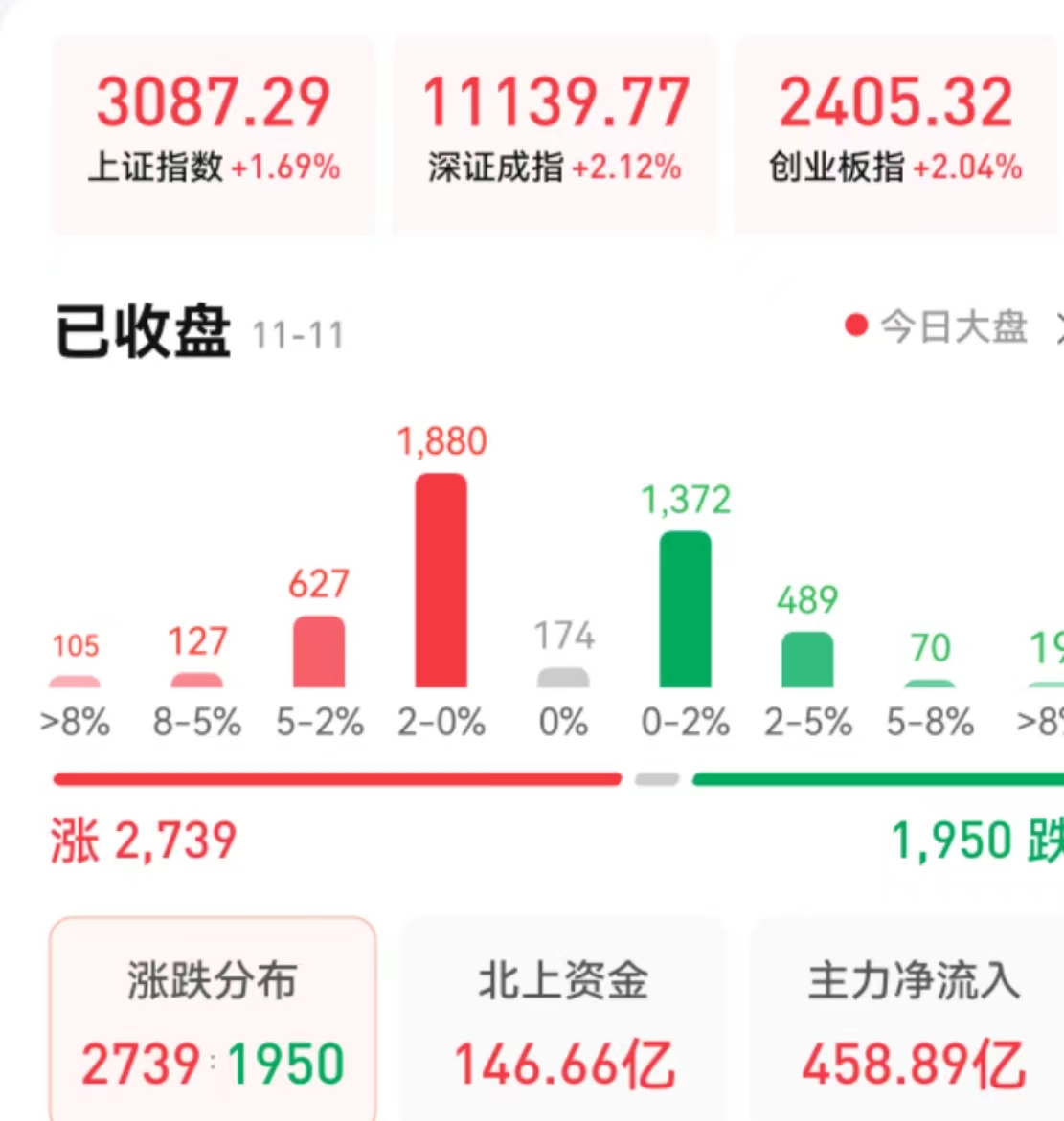 周五(11月11日),A股三大指數(shù)震蕩上揚(yáng)。截至收盤,上證指數(shù)漲1.69%報(bào)3087.29點(diǎn),深證成指漲2.12%報(bào)11139.77點(diǎn),創(chuàng)業(yè)板指漲2.04%報(bào)2405.32點(diǎn);兩市合計(jì)成交12231億元,北向資金凈買入146.66億元??傮w來看,兩市個(gè)股漲多跌少。