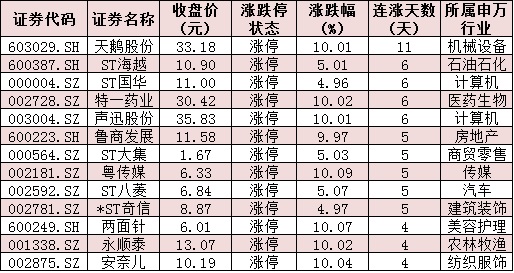 表:連續(xù)上漲4日且今日收盤(pán)漲停個(gè)股情況: