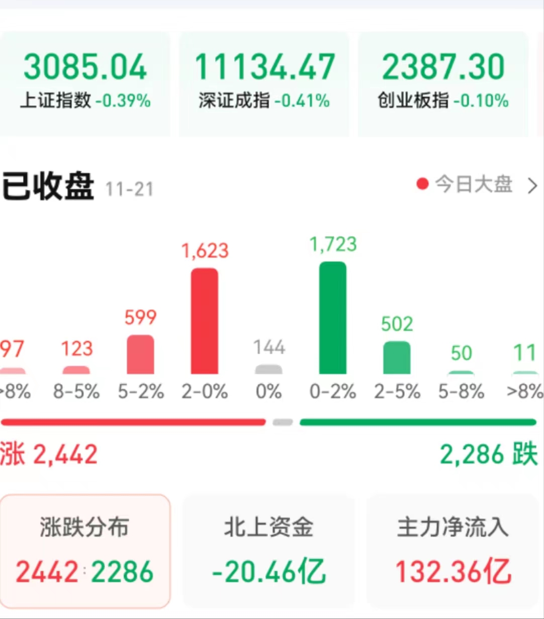 周一(11月21日),A股三大指數(shù)震蕩走弱。截至收盤(pán),上證指數(shù)跌0.39%報(bào)3085.04點(diǎn),深證成指跌0.41%報(bào)11134.47點(diǎn),創(chuàng)業(yè)板指跌0.1%報(bào)2387.3點(diǎn),北證50指數(shù)漲2.55%;兩市合計(jì)成交額8492億元,北向資金凈賣出20.46億元??傮w來(lái)看,兩市個(gè)股漲多跌少。