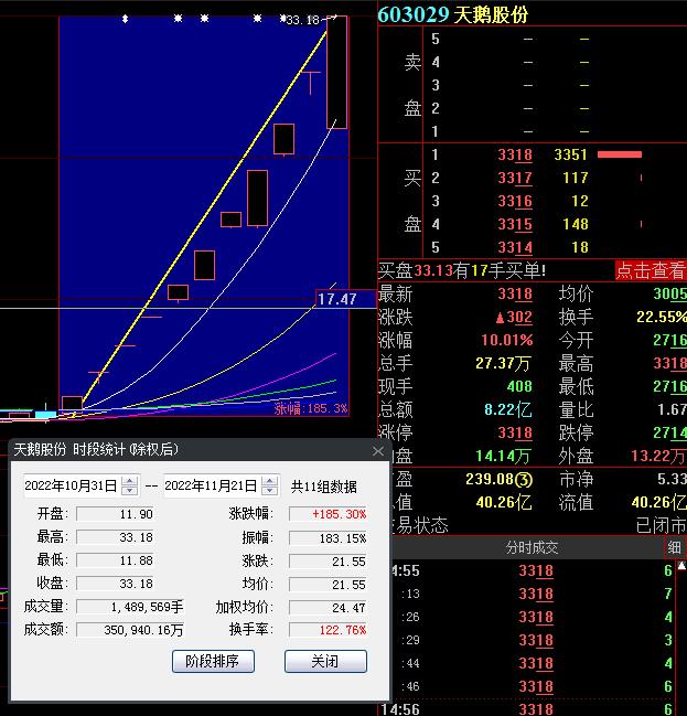 11月21日,熱門(mén)股天鵝股份今日復(fù)牌再度漲停,截至收盤(pán),報(bào)33.18元,自10月31日至今,實(shí)現(xiàn)連續(xù)11個(gè)交易日漲停,累計(jì)漲幅達(dá)185.3%,此前10連板被特停5個(gè)交易日。