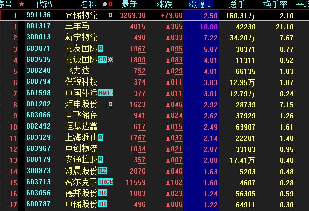 具體來(lái)看,截至上午收盤(pán),倉(cāng)儲(chǔ)物流板塊上漲達(dá)2.5%,漲幅居首。其中,三羊馬漲停。